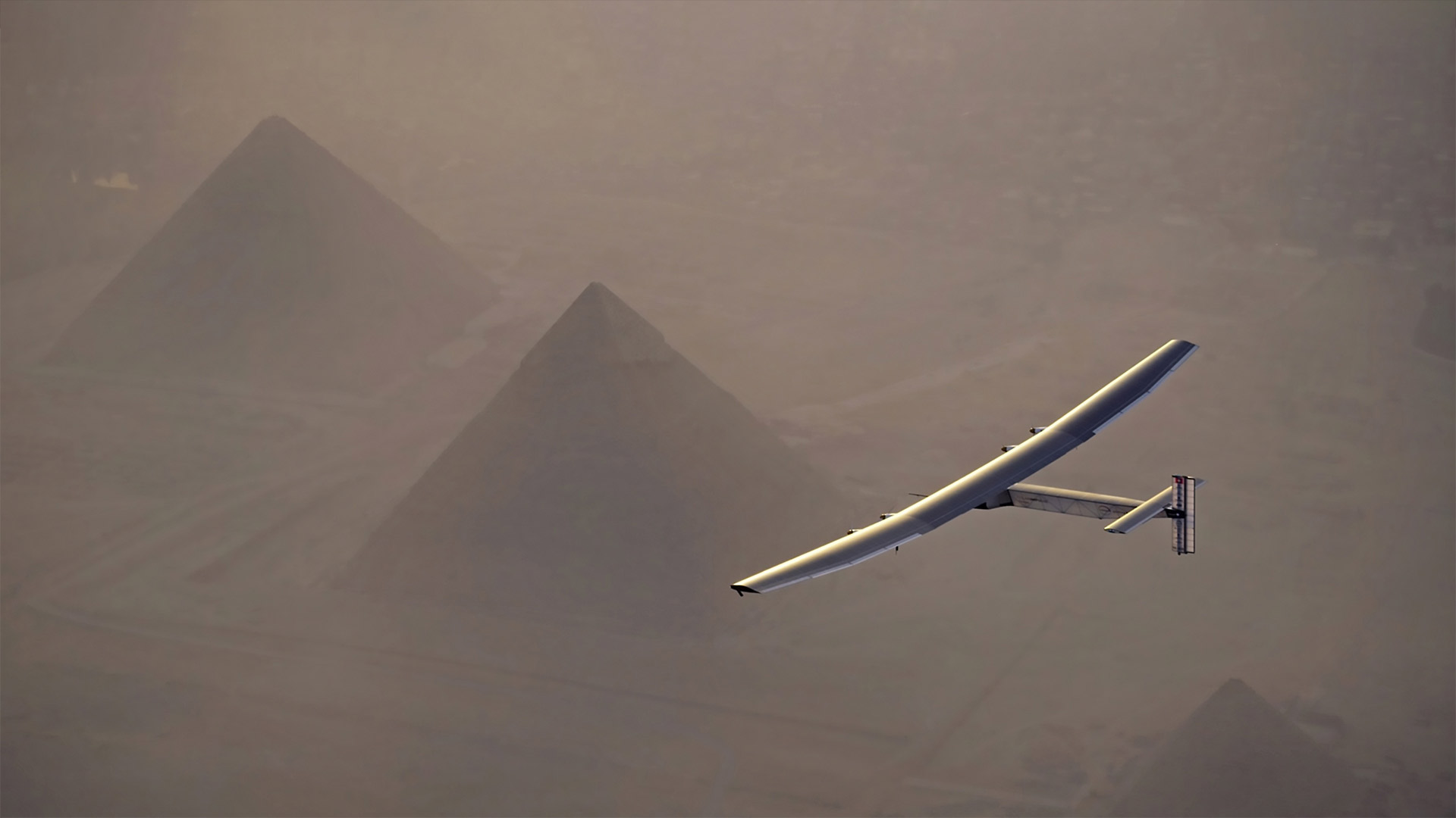 Solar Impulse 2 flying over the pyramids in Giza
