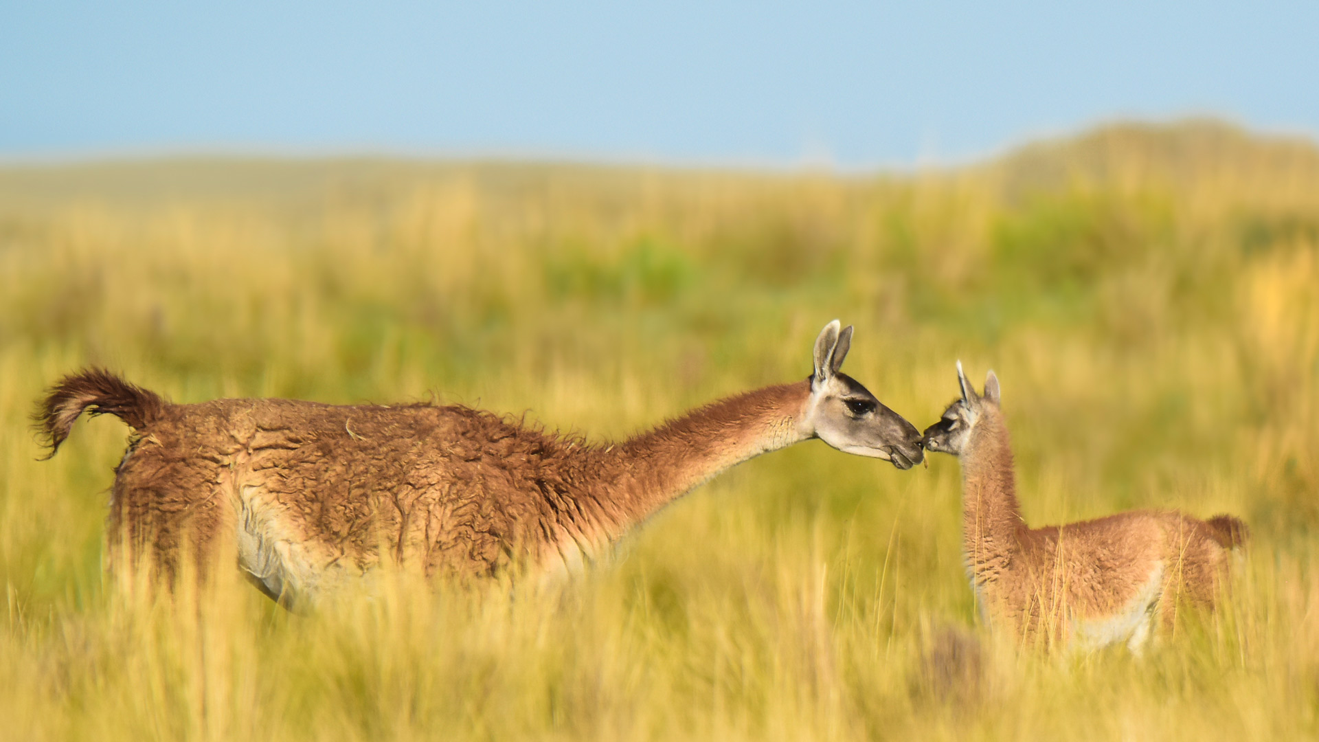 Guanaco mother and newborn baby in grassland